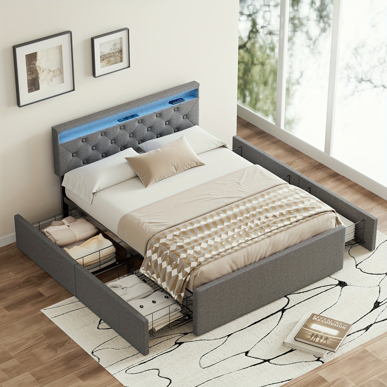 Kehot Letto Matrimoniale 140x200 con LED e 4 Cassetti Contenitore, Letto Imbottito in Tessuto Grigio con Testiera LED USB, Struttura Letto con Doghe in Legno e Metallo