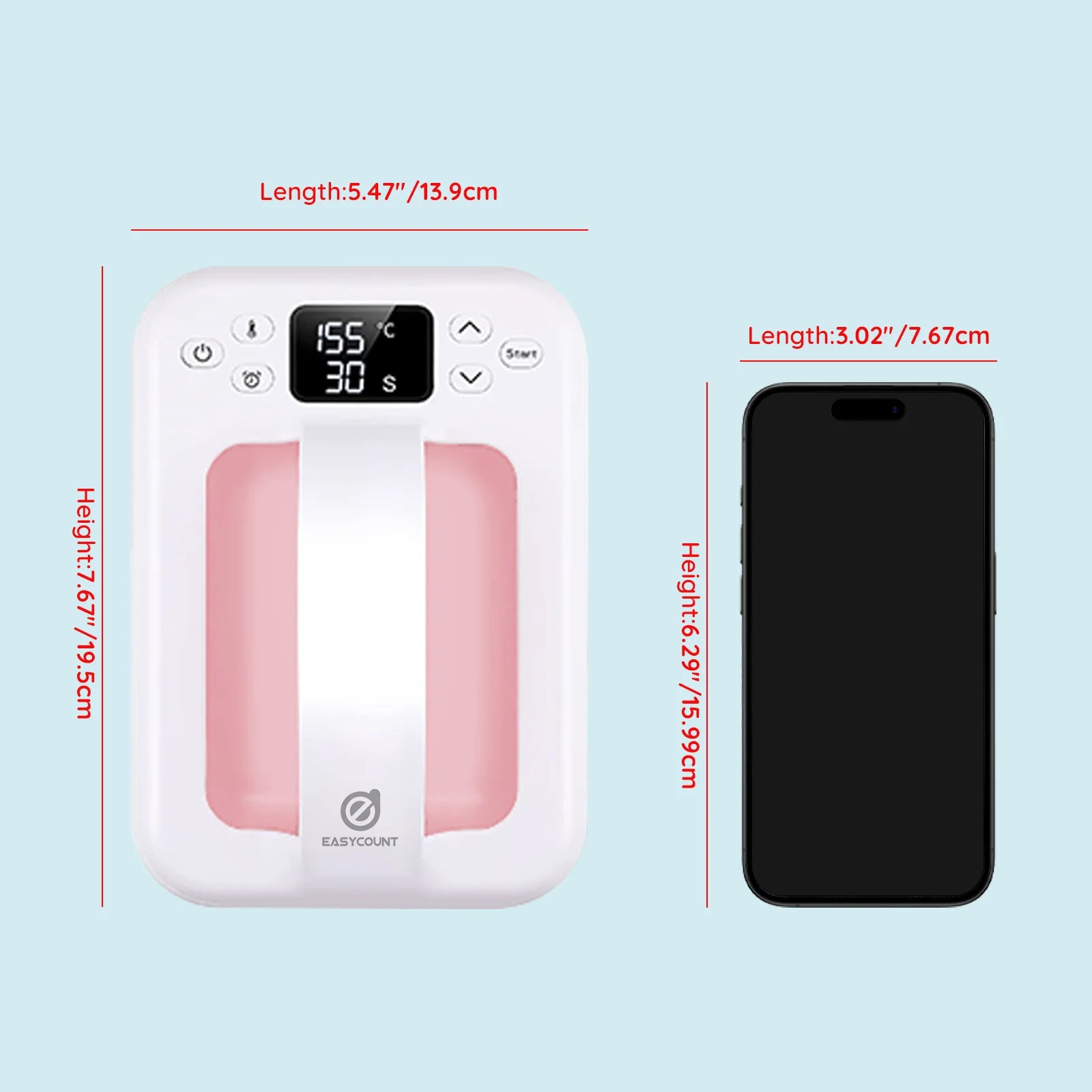 BURN TIMING AND PREVENTION FUNCTION: This heat press is equipped with a convenient countdown timer, eliminating the need to constantly check the time and reducing the risk of errors. The insulated base plate of the heat press is made of high-temperature resistant material up to 205℃(400°F), preventing accidental burns. PERFECT SIZE E: This small heat press measures 7.9×5.5 inches, perfect for clothes of different sizes, and can easily transfer models twice as large as the heat press. Whether it is children or adults, shop operations or home use. They are the best gifts for your family.