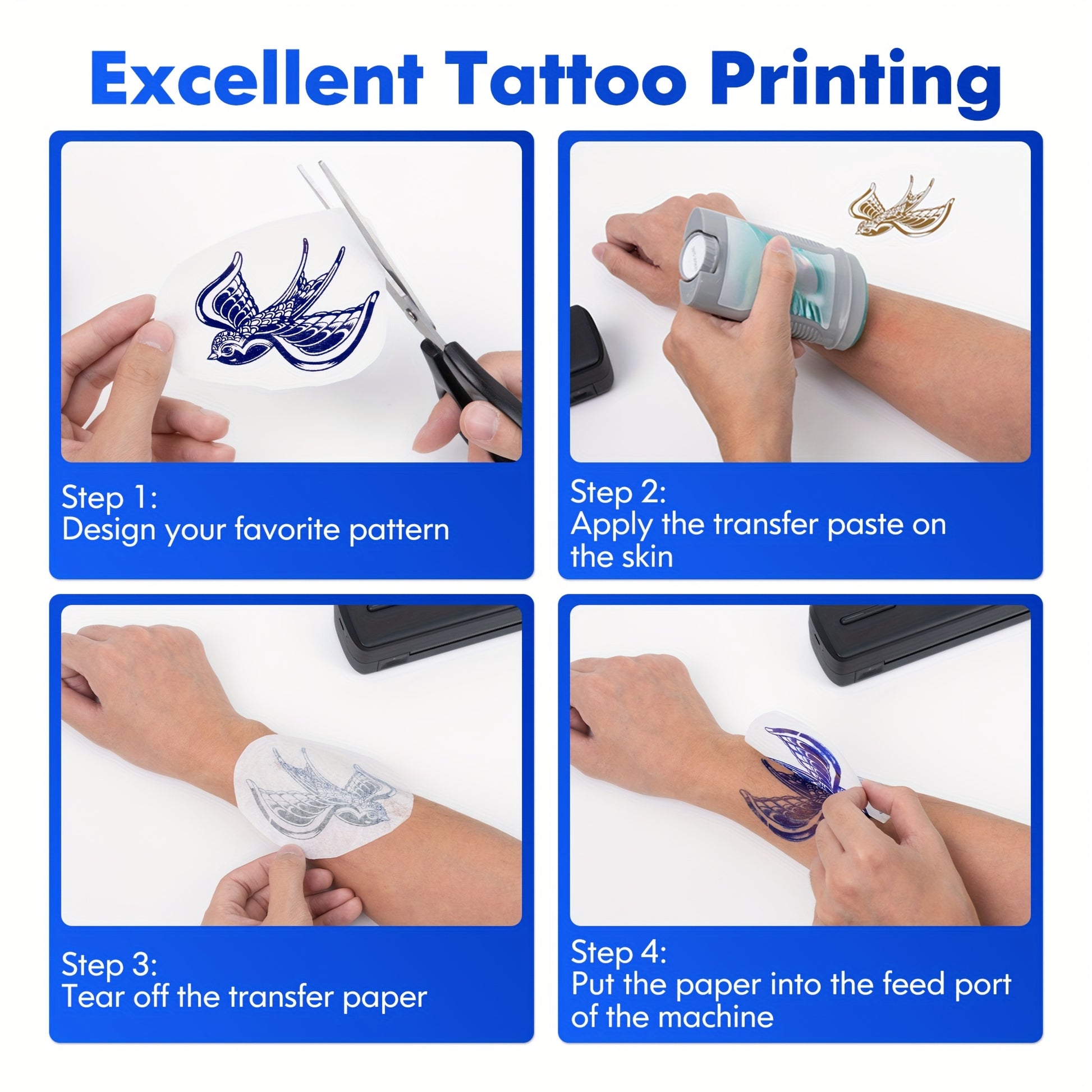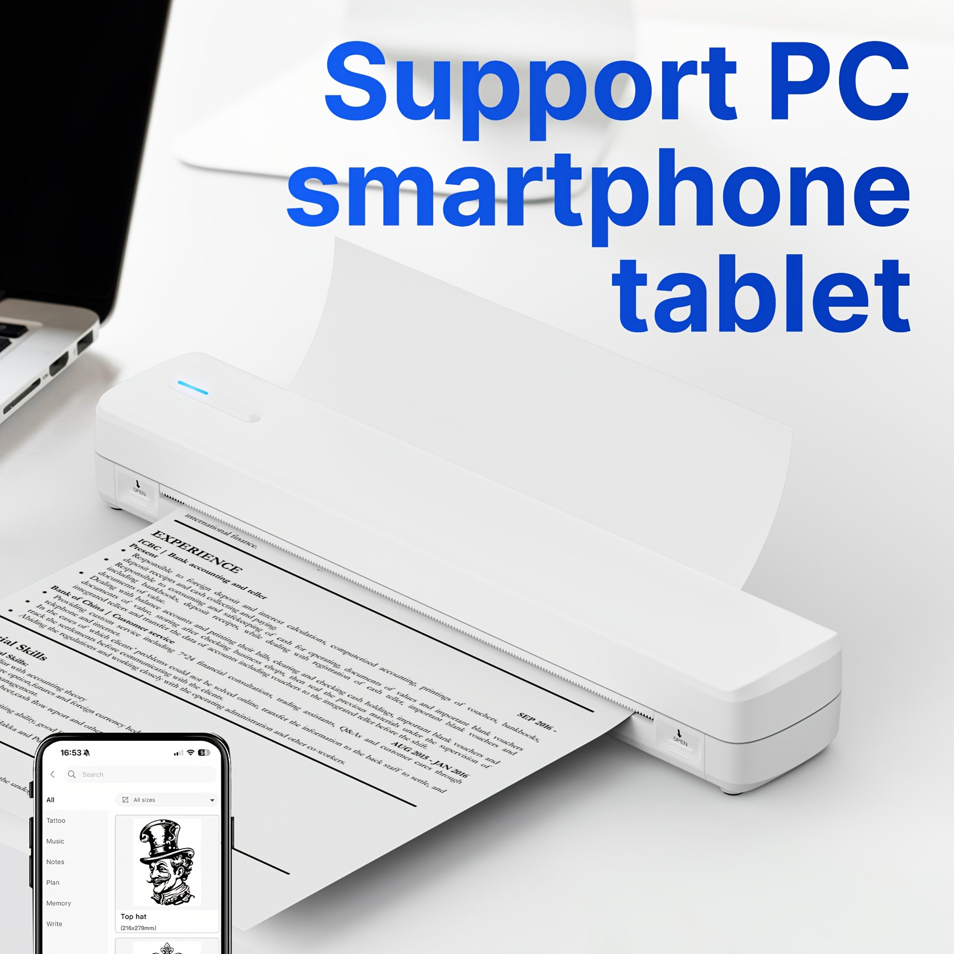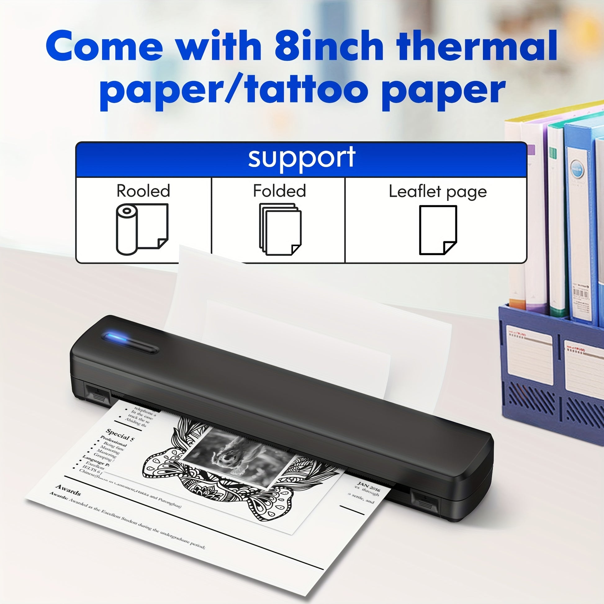 Questa stampante portatile è compatibile con carta in rotolo, carta a fisarmonica e carta per trasferimento di tatuaggi, e supporta la stampa di PDF, Word, immagini e pagine Web dal telefono, ovunque e in qualsiasi momento.