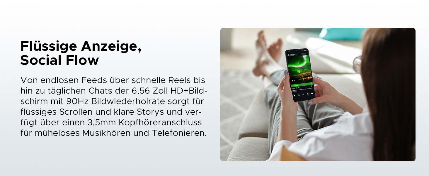 8,45mm Ultradünnes + 6.56"HD + 90Hz: DOOGEE Note 56 Android 16 Smartphone hat ein ultradünnes Gehäuse von 8,45mm und wiegt 195g. Dadurch ist es leicht und einfach zu transportieren. Der Bildschirm ist 6,56" HD breit und liegt gut in der Hand. Das günstige DOOGEE Android 16 Handy verfügt außerdem über eine hohe Bildwiederholfrequenz von 90Hz, die einen klaren und hellen Bildschirm mit flüssigen, dynamischen Bildern gewährleistet und so die visuelle Ermüdung reduziert