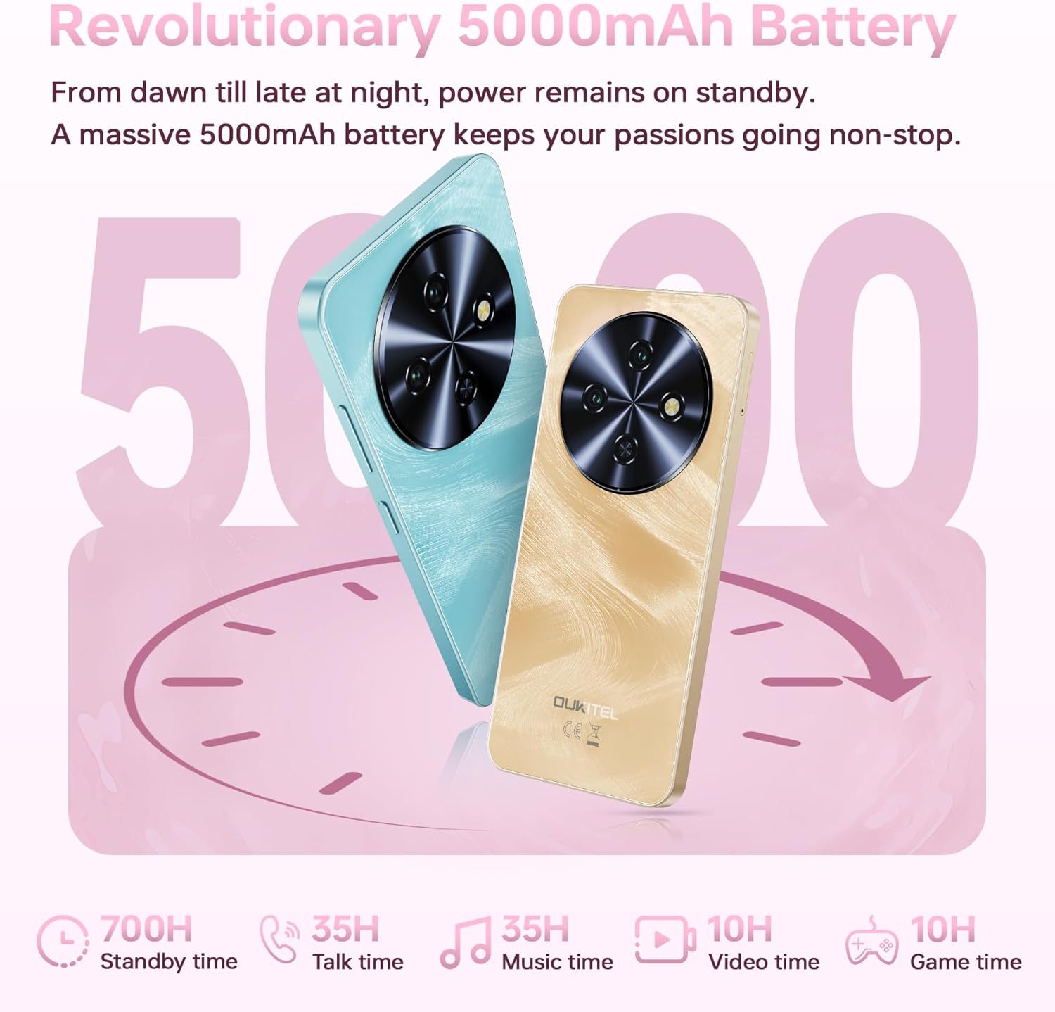 5000mAh Battery & OTG: The OUKITEL C5 phone features a powerful 5000mAh battery and a Type-C charging port, allowing you to immerse yourself in gaming battles or multimedia entertainment without worrying about battery life. Additionally, this OUKITEL C5 phone supports reverse charging via OTG. When your headphones, smartwatch, or other devices are low on power, simply turn your smartphone into a portable power bank to charge them anytime, anywhere