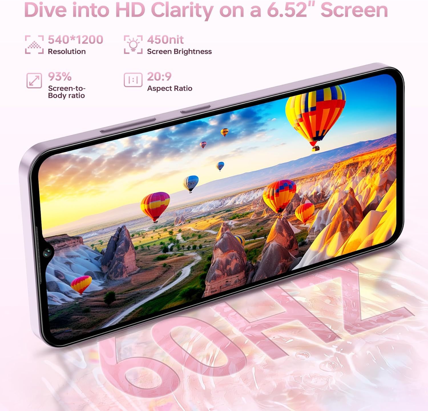 6.52" HD+ Waterdrop Screen: The OUKITEL C5 is an elegant and lightweight smartphone that fits comfortably in your hand. Featuring a 6.52-inch transparent waterdrop notch display with an ultra-slim profile of just 9. 3mm, it weighs only 193g, whether you keep it pocketed or hold on to its sleek design for easy handling. 20: 9 aspect ratio screen offers vibrant colors, 450nit brightness enhances contrast levels while delivering crystal clear images frame by frame