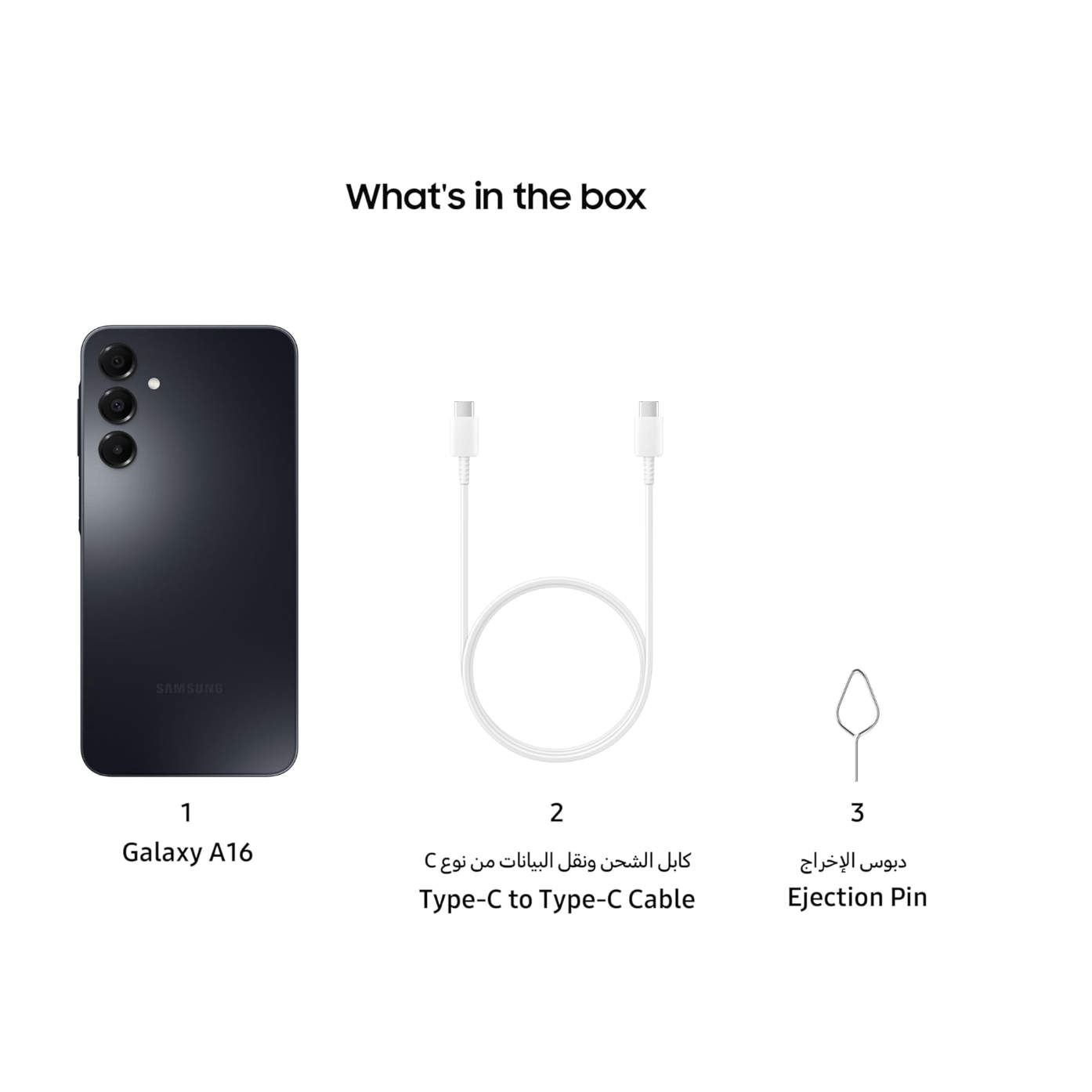 Package contents: Samsung Galaxy A16, USB-C cable, documentation