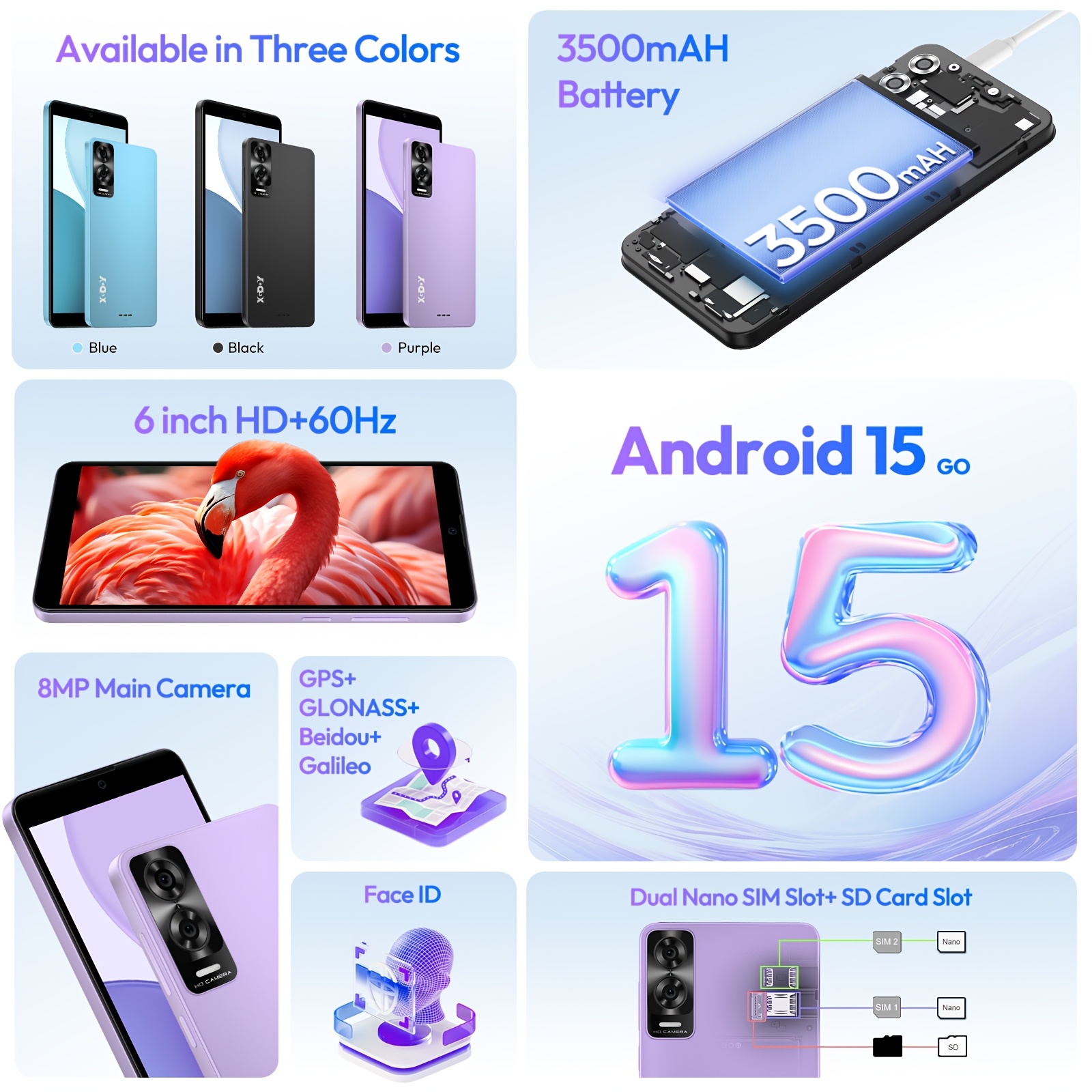 XGODY Android 15 Smartphone | 6.0" Touch Screen, 7GB RAM+32GB ROM, 4G LTE Dual SIM, Octa-Core Processor, 5MP+8MP Camera, Face Unlock, 3500mAh Battery