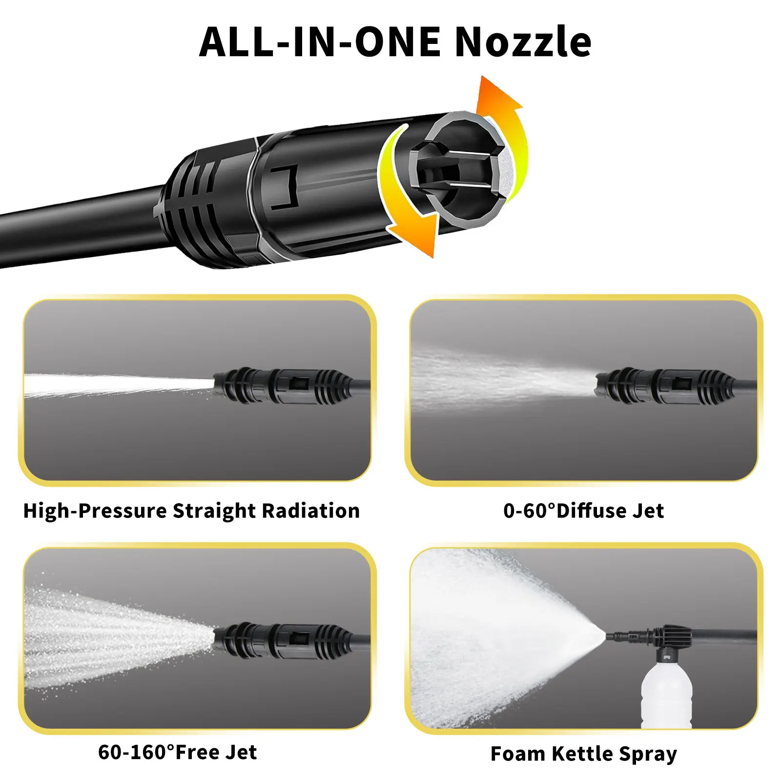 Adjustable Pressure Nozzle: Comes with 3 spray angles (0°, 60°, 160°) for light, medium, or heavy-duty cleaning. Switch modes quickly to achieve the best cleaning effect.