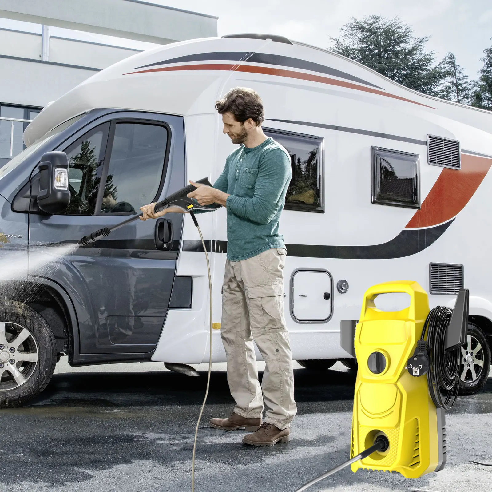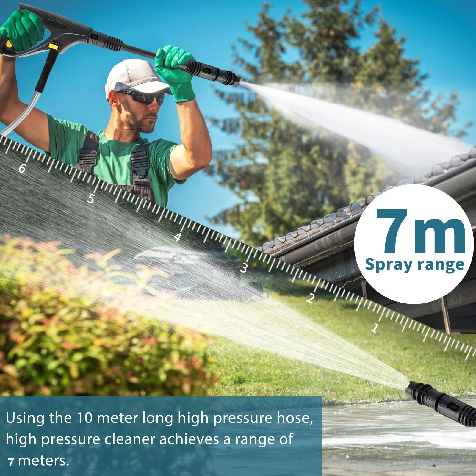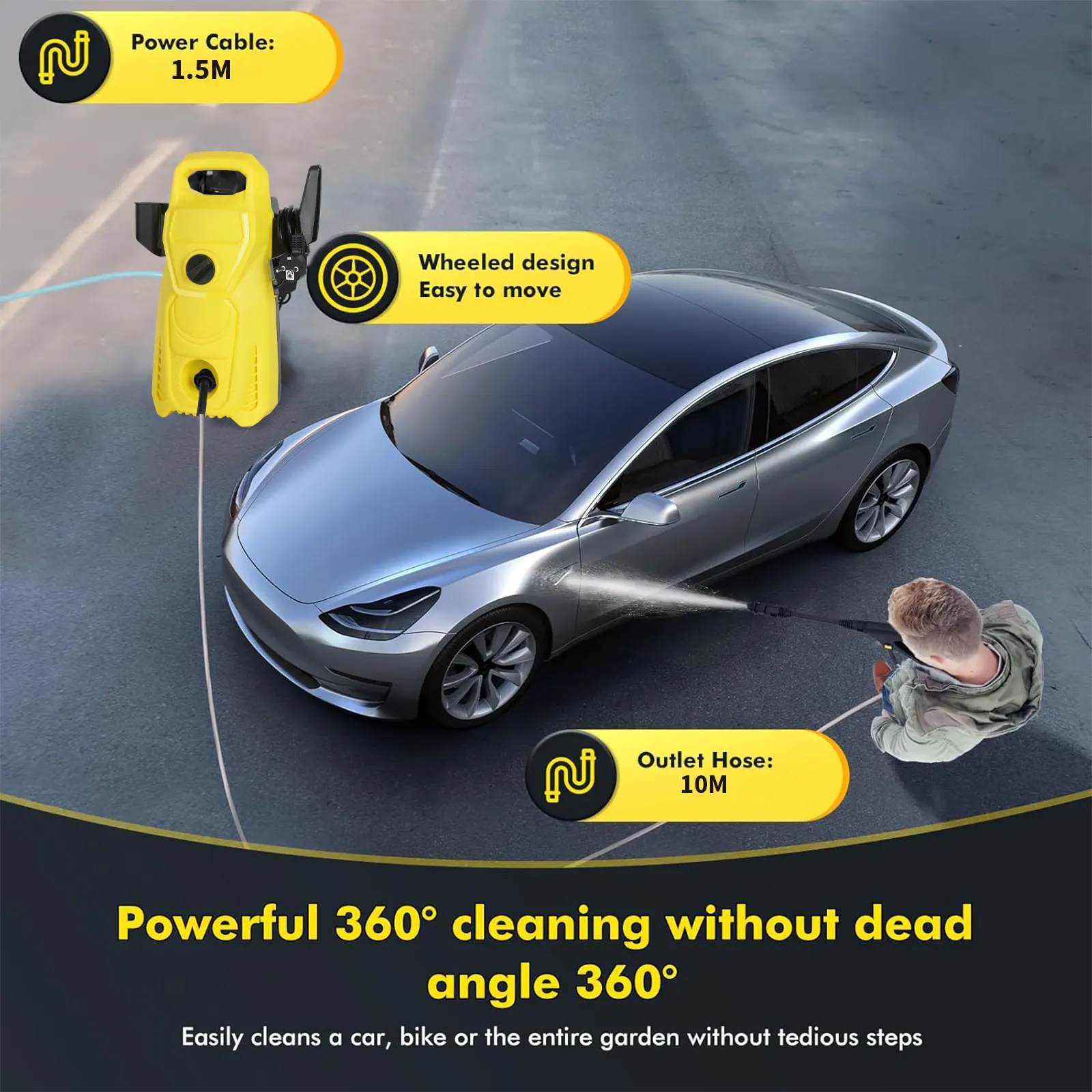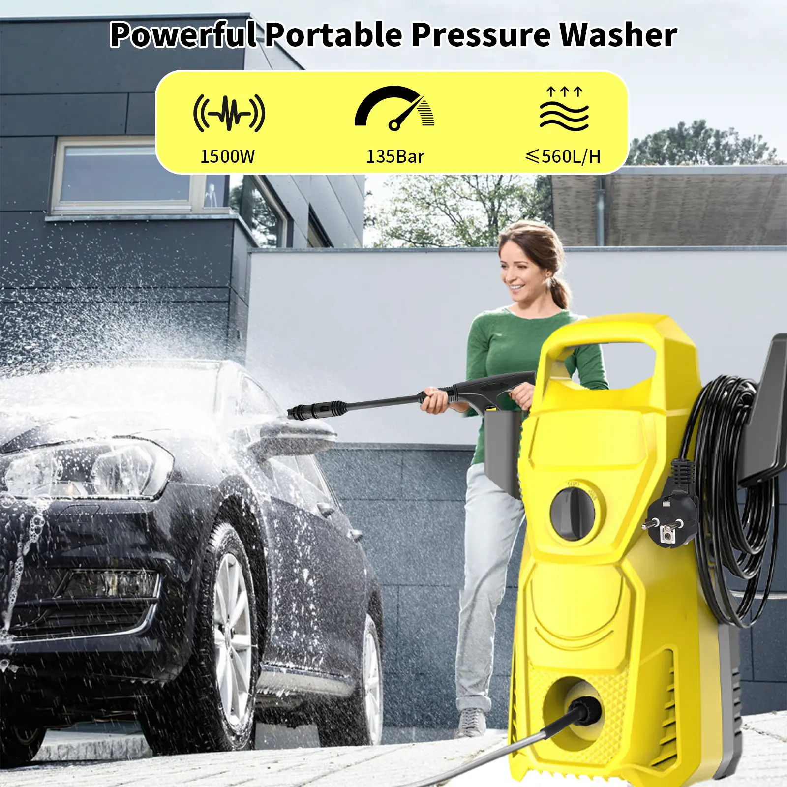 Powerful Cleaning Performance: Equipped with a 1500W motor, delivering up to 135 bar pressure and 560 L/h water flow. Easily removes dirt from patios, balconies, driveways, siding, sheds, cars, outdoor equipment, and more.