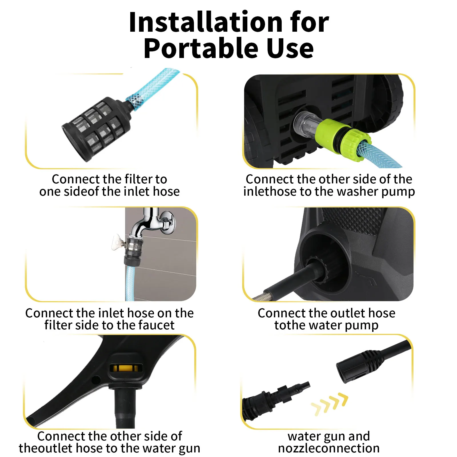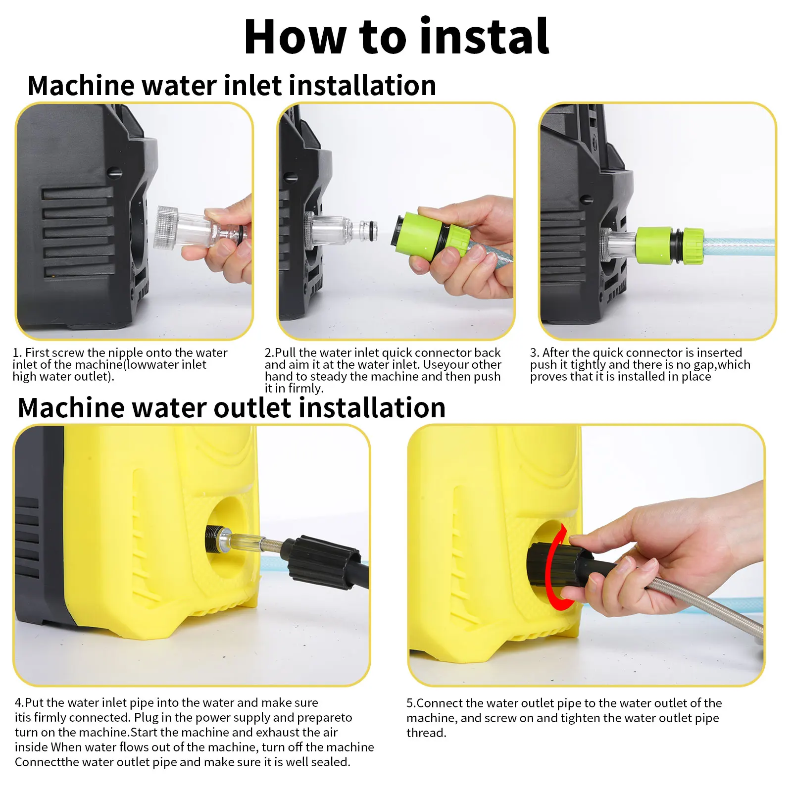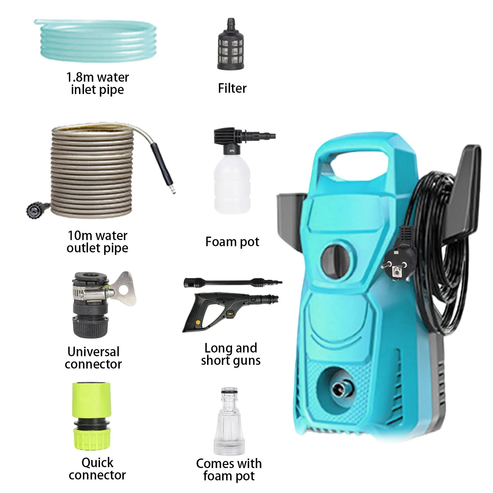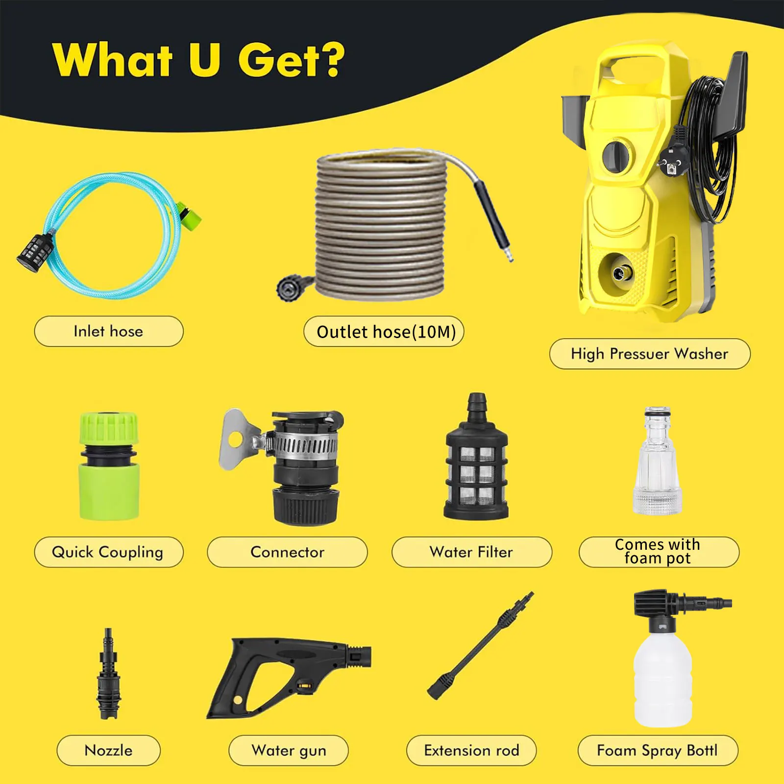 Package Includes 1 × Main Unit 1 × 1.8m Water Inlet Pipe 1 × Filter 1 × 10m Outlet Pipe 1 × Spray Gun 1 × Extension Rod 1 × Short Rotary Nozzle 1 × Foam Pot 1 × Quick Connector 1 × Faucet Quick Connector